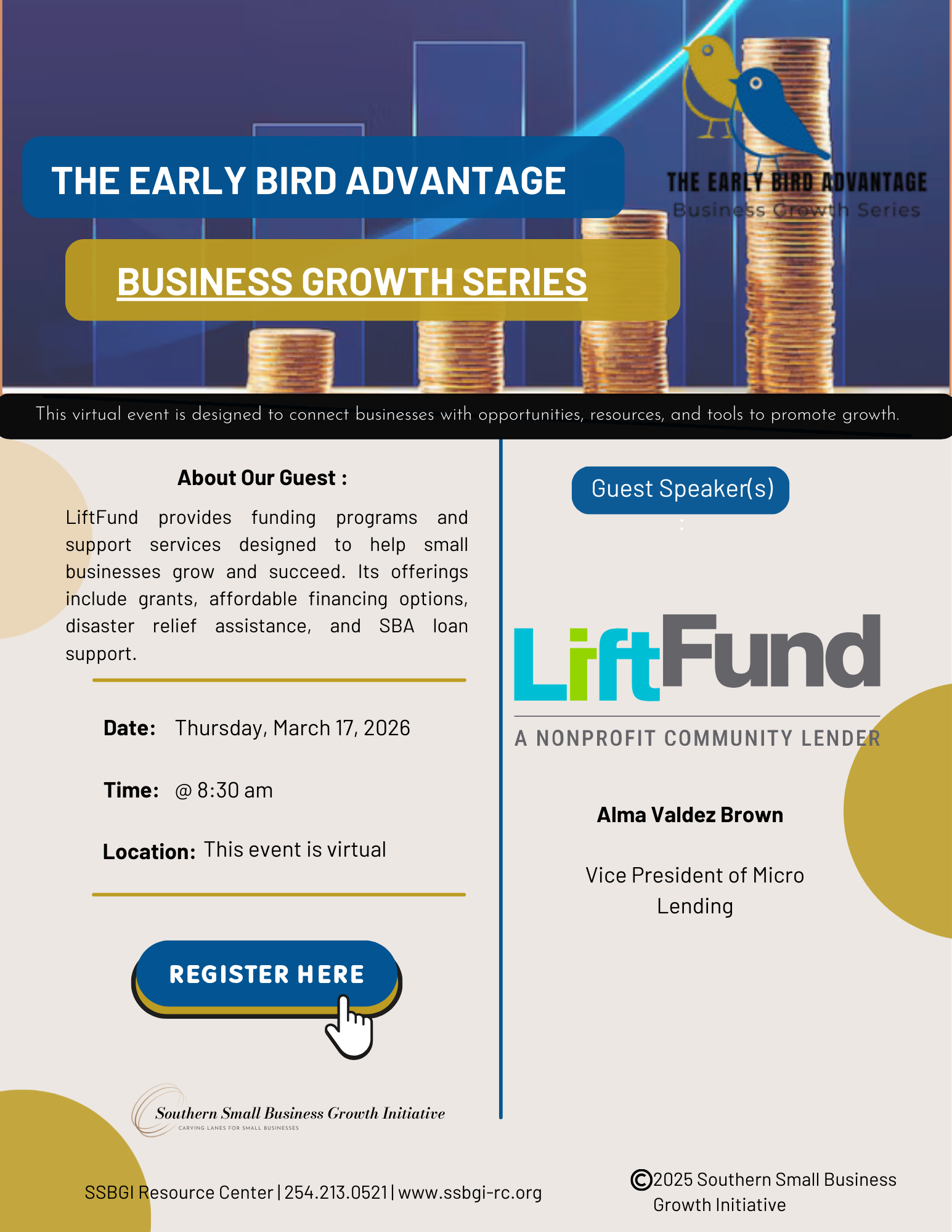 The Early Bird Advantage: Business Growth Series delivers valuable insights to help small businesses grow. Learn about upcoming bid opportunities, funding resources, training programs, procurement processes, and much more. This month’s session focuses on funding opportunities available to small businesses through LiftFund.